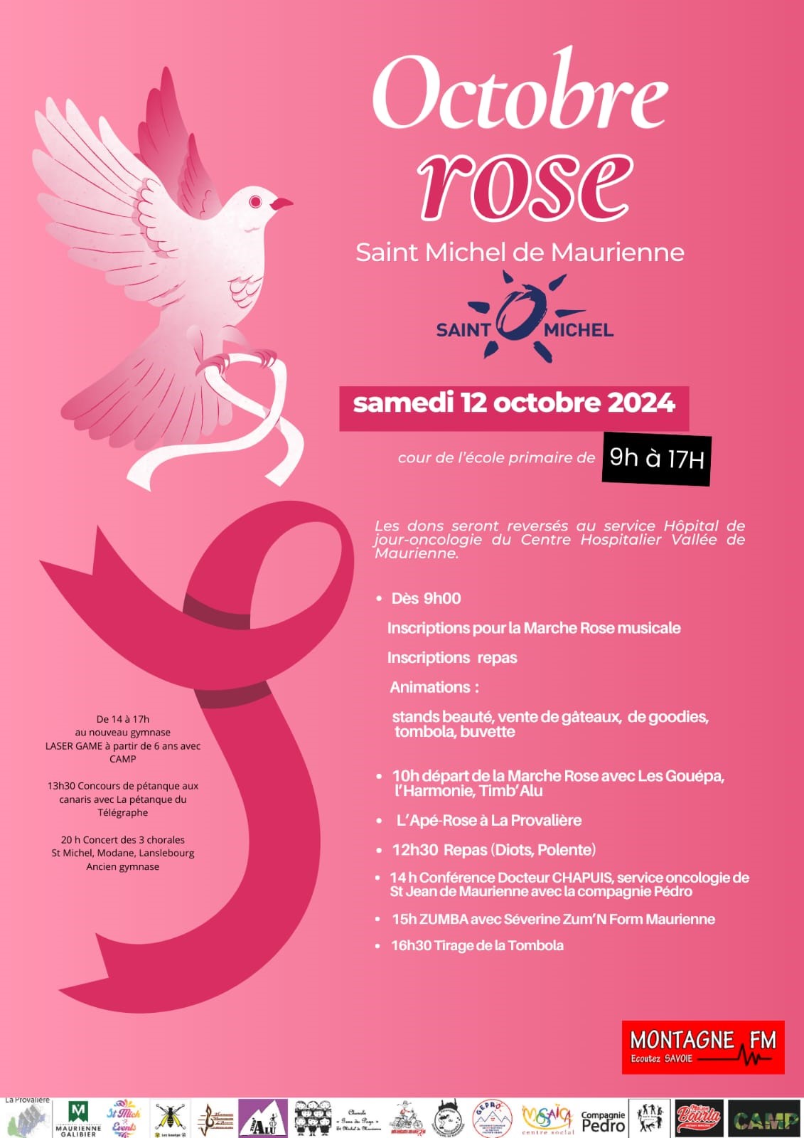 Octobre Rose à Saint-Michel-de-Maurienne c'est toute une journée en rose avec des animations (stand beauté, vente de gâteaux, goodies, etc.), une marche rose musicale avec Les Gouépa, l'Harmonie et Timb'Alu, un Apé-rose, un repas qui se terminera par une intervention du Dr Viviane Chappuis, cheffe du service Hôpital de Jour-Oncologie du CHVM, une séance de zumba, et une tombola.